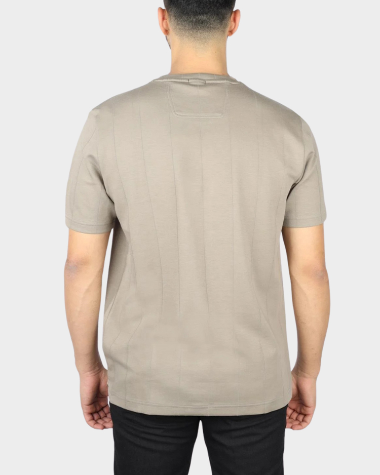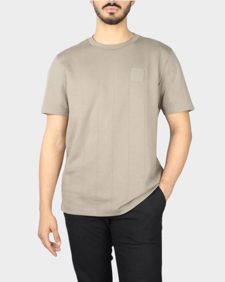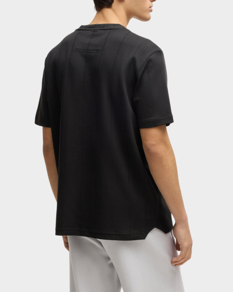 טי שירט גברים ייחודית לגברים מבית BOSS Menswear, בגזרת Relaxed נינוחה עם בד גמיש ונעים למגע. מעוצבת עם דוגמת תפירה מסוג Drop-Needle להוספת טקסטורה ייחודית ומעוטרת בתווית לוגו טונאלית בחזית למראה אלגנטי ומעודן.