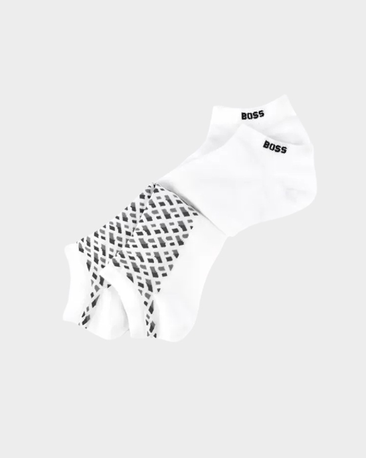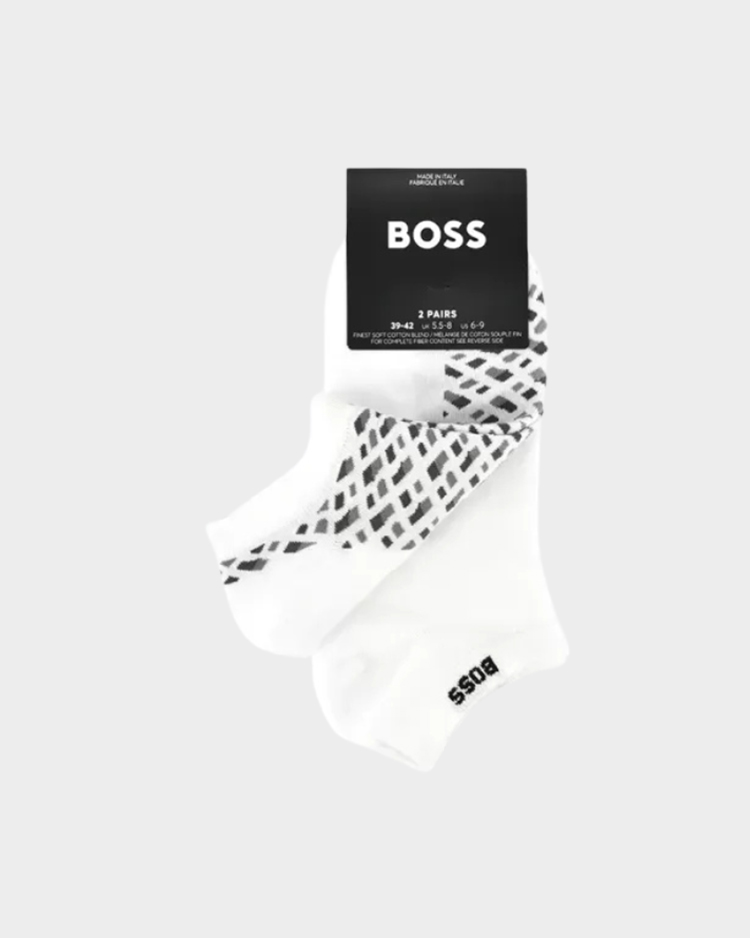 מארז גרביים מבית בוס הכולל זוג אחד בעיצוב חלק וזוג נוסף עם הדפס מונוגרמה. הגרביים עשויים מתערובת כותנה מסורקת עם אלסטיות לנוחות ולשמירה על הצורה לאורך זמן. כוללים חיזוק בעקב ובאצבעות לעמידות מוגברת ונעילה נוחה לאורך כל היום.