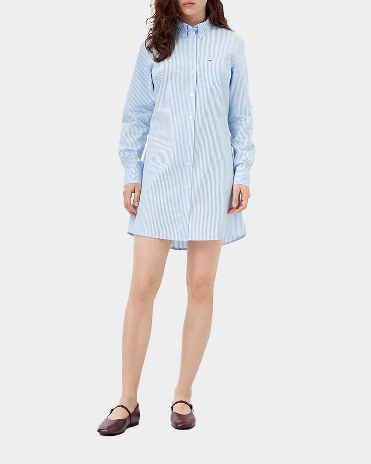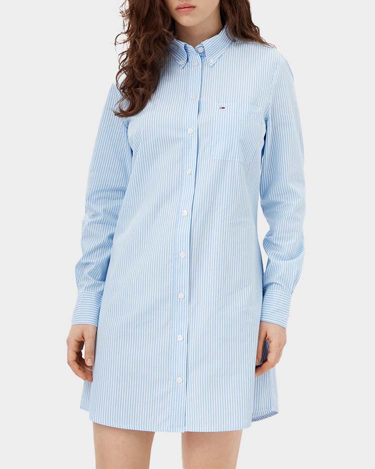 שמלת כפתורים בסגנון קז'ואל מבית טומי ג'ינס, בעיצוב קלאסי עם דוגמת פסים. מגיעה בגזרה רגילה עם סגירה קדמית בכפתורים, מושלמת למראה יום-יומי מלא בסטייל.