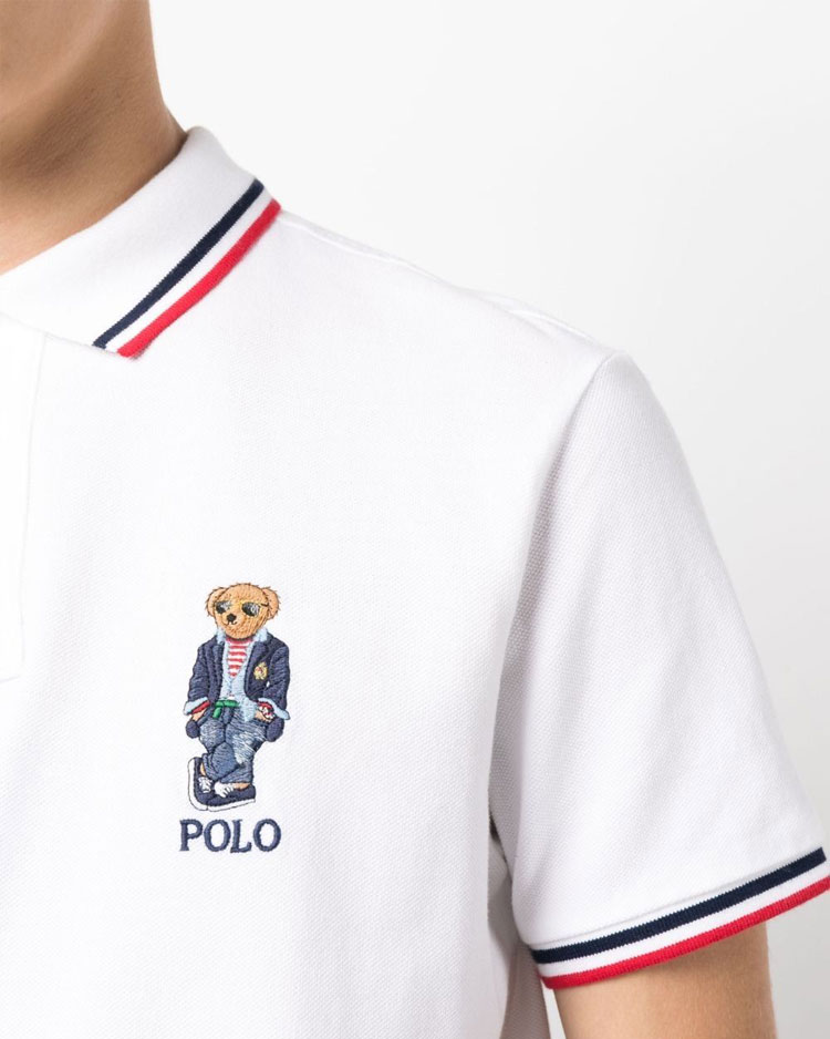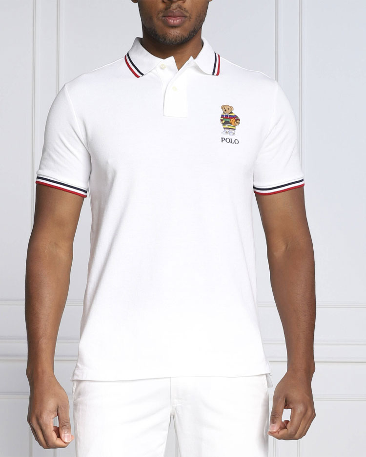 חולצת פולו בגזרת פסים מבית POLO RALPH LAUREN הכוללת עיטור לבן, כותנה, פסים, מוטיב פולו דוב ייחודי, צווארון פולו, כיגור קצר בחזית, שרוולים קצרים ושולי ישר.