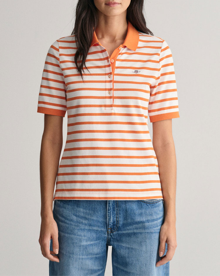 חולצת פולו לנשים של גאנט מבד פיקה כותנה רך ונושם, בגזרה דקיקה עם צווארון פולו קלאסי ושרוולים קצרים. החולצה כוללת כיס צר ואלגנטי עם כפתורי חיקוי אם הפנינה, לצד מכפלת צדדית עם שסעים ולוגו רקום בחזה. שילוב מושלם בין סגנון יומיומי לנוחות מרבית. הרכב הבד: 100% כותנה.
